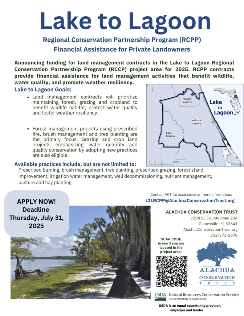 Alachua Conservation Trust (ACT) is currently taking applications for land management financial assistance for two Regional Conservation Partnership Programs (RCPP).
